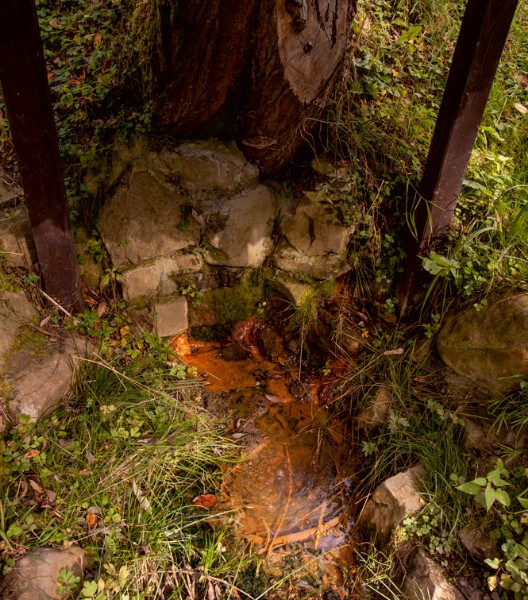 Na wyjątkowo atrakcyjną oprawę mofety wpływa bulgoczące rdzawożółte błoto, kolorystycznie kontrastujące z porastającą je intensywnie zieloną, niskopienną roślinnością. Wytrąca się ono z wód wypływających tu szczaw, zawierających dużą ilość związków żelaza i ma charakter koloidalnej, czerwonobrunatnej galaretowatej zawiesiny, cienkiej powłoki lub spienionego żelu. Osad ten zawiera także wiele minerałów wymytych ze skał podłoża, takich jak: kwarc, kaolinit, illit, montmorillonit, kalcyt, skalenie i chloryt. Ten rdzawy sedyment nazywany jest potocznie „rudawką” a jego nagromadzenie może doprowadzić do powstania ochry, cenionego od czasów paleolitu surowca mineralnego.